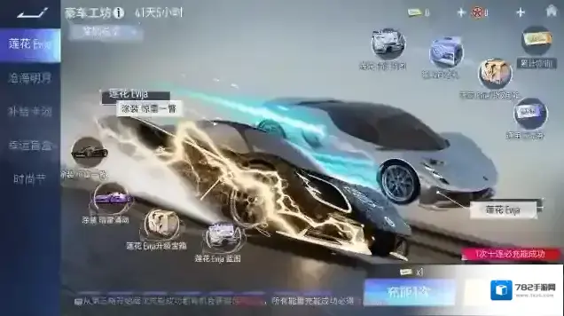 『获取方式』车手们使用“豪车通用签约券”即可在“豪车工坊”中参与抽取~每次抽奖都可能充能成功,每次充能成功会点亮能量槽并获得超级奖励之一。从第三格起,每次充能成功都有机会直接获得莲花 Evija,所有能量充能成功必得车辆大奖!根据当前充能成功的次数,界面中还将显示不同次数的十连保底,第一次十连必定充能成功哦!ps.本次抽奖中增加车辆零件数量的获取,车手们在抽奖过程中可获取大量专属零件哦~