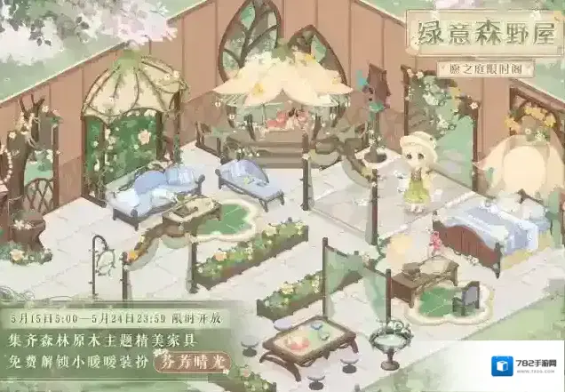 5月15日5:00-5月24日23:59,在小屋愿之庭的限时抽奖阁“绿意森野屋”许愿,可获得森林原木主题精美家具!集齐所有限定家具还可领取全新小暖暖装扮“芬芳晴光”!