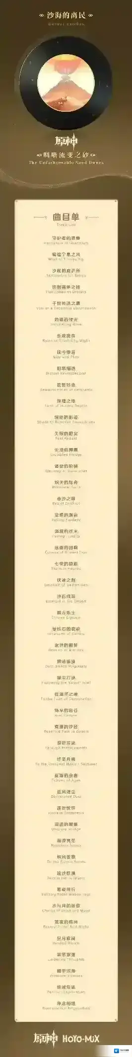 「《原神》第二张须弥篇OST即将上线」旅行者们大家好,《原神》第二张须弥篇OST《啁哳流变之砂The Unfathomable Sand Dunes》即将上线,专辑分为《风沙往事Sandstorm Remembrances》《沙海的离民Desert Exodus》与《须弥斗战篇2 Battles of Sumeru 2》3张分碟,共收录108首由HOYO-MiX音乐团队为《原神》须弥地区创作的原声音乐。