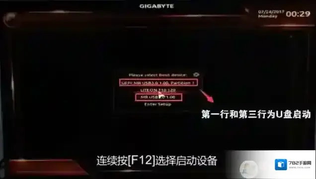二、技嘉B250主板U盘启动1、插入我们制作好的U盘启动盘,然后重启不停的按F12,这时会出现启动项选择菜单,我们会出现有UEFI的U盘和没有U盘,装Win7我们选择不带UEFI的启动;