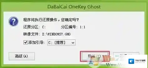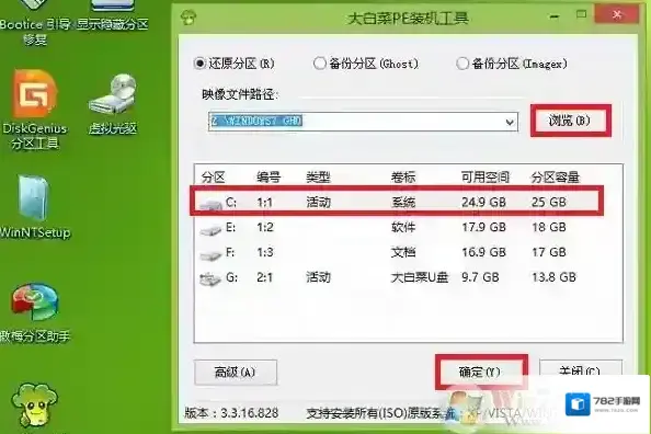四、安装Win7系统1、运行PE桌面上的一键装机工具,然后选择Win7.GHO镜像,并且选择C盘,然后确定安装即可。