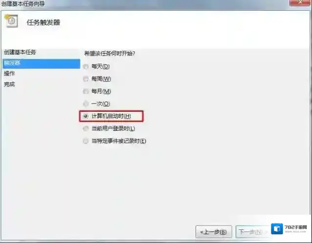 5、触发器设置为计算机启动时,或者按时间、每天、每月,如果设置为按时间启动,那么还需要设置一下开始时间;