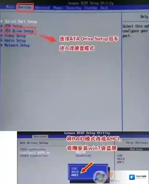 4、将键盘移动Devices选项,把键盘移动ATA Drive Setup回车,将configure SATA as中默认的raid改成ahci模式,否则安装win7时会出现0x0000007b蓝屏,因为win7中没有集成raid硬盘驱动,然后选择F10保存设置,在弹出的选项中选择YES,如下图所示;