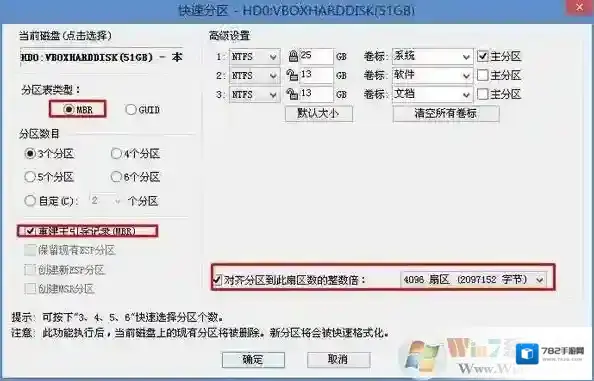 重新分区:磁盘格式转换完成后,点击快速分区,勾选 分区表类型为 MbR ,勾选了重建主引导记录MBR,选择需要分区的个数以及大小,当然大家可以点击“自定”来设置合适的分区,按下确定后开始分区(如果是固态硬盘或者是东芝的硬盘要进行4K对齐一下),如下图: