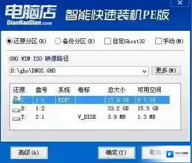 3、分区完成后运行桌面的”一键装机还原”工具,然后选择win7系统镜像文件,以c盘为系统盘,把win7系统安装在c盘中,点击确定;