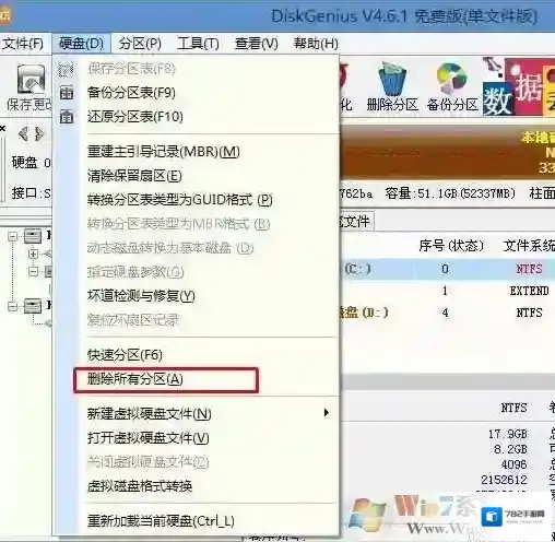 2、打开桌面上的Diskgenius分区工具(DG分区工具);打开Diskgenius后,选择笔记本硬盘,然后点击“硬盘”,查看菜单中的“转换分区表类型为MBR格式”选项是否灰色,如果是灰色的话那么我们就无需进行重新分区,除了C盘系统盘和桌面上的资料,重装系统后其他磁盘中的资料都不会被清空,如果“转换分区表类型为MBR格式”选项是可选的,则需要将整个硬盘格式化,操作方法如下:删除分区:点击“硬盘”–“删除所有分区”,删除前确保资料已经转移,删除后,点击保存更改,如图: