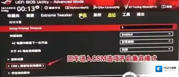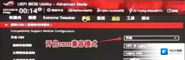 5、再返回到”启动”的选项,把CSM由disabled改成enabled,开启兼容模式,然后按F10保存如下图所示;