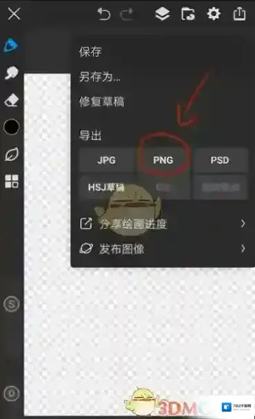 6、接着点击右上角的“分享”图标,在弹出的窗口找到“导出”选项,下方有“JPG”、“PNG”、“PSD”等文件格式,这里点击“PNG”选项,导出的图片就是透明底了。