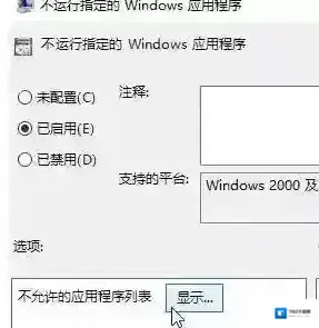 7、切换到组策略中的不要运行指定的Windows应用程序,点击已启用,然后点击下面的显示,如图: