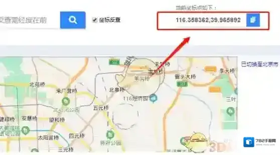 5、在地图上点击一个位置,右上方会出现点击位置的坐标。