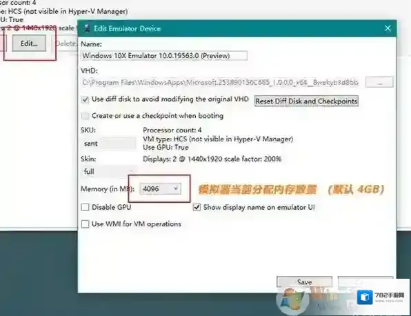 此外你也可以通过旁边的“Edit”按钮,为模拟器分配更多的运行内存(默认4GB)。具体数值根据您电脑的实际情况来定,比如小编的电脑是24GB内存,便分配给了模拟器6GB。当然这里不设置也没有问题,默认的4GB也是OK的。