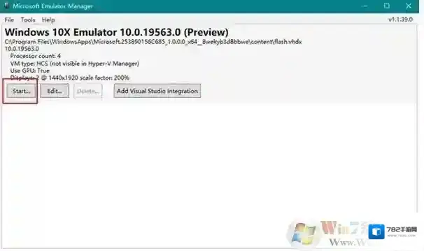 1、下载完成后,就能在开始菜单看到新装好的Microsoft Emulator了,打开后会弹出以下界面。这里会显示出当前电脑的硬件配置,以及自动加载好的Win10X镜像版本号,点击“Start”按钮即可启动Win10X。