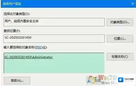 4、在选择用户或组窗口,点击“高级”。