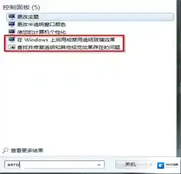 win7系统打开Aero方法:1.打开“开始”菜单,在搜索栏目中输入“aero”,选择在“Windows上启用或禁用透明玻璃效果”或者“查找并修复透明和其他视觉效果存在的问题”。如图8所示:
