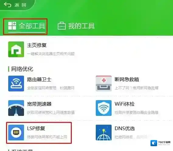 2、点击全部工具、选择lsp修复