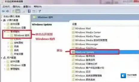 7.依次点开左边栏,找到管理模板/Windows组件,找到Windows update,双击