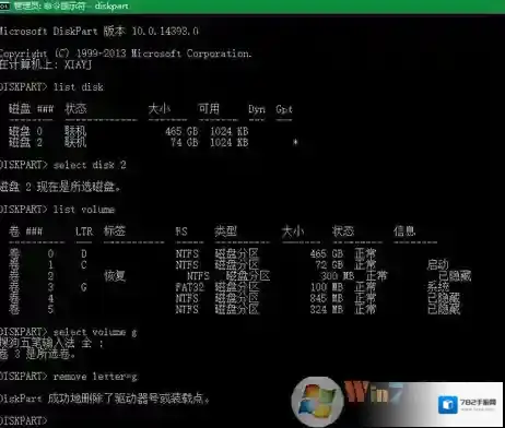 7、remove letter=x 删除指定卷驱动号 (图中G盘为要删除盘符的EFI分区)