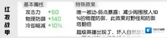 红衣战甲也是一件半肉装备,进一步提高大鹏的生存能力,另外还有10%的冷却缩减。弱点暴露的效果偏团队向,在中后期的团战中,配合大鹏突入接大招的特性,能有非常理想的效果,变相提高了团队的物理输出能力。如果想要更肉的话可以选择尖刺路障,但这类纯肉装备在后期面对远程输出时,可能只是让你多站了几秒,如何抉择还是看局势决定。