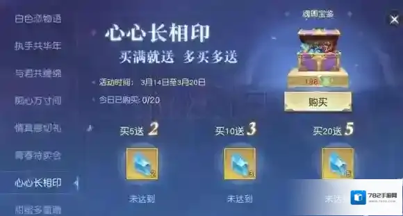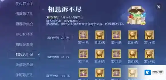 即日起至3月27日,“甜蜜多重赠”活动中只要每天达到不同的充值额度就能收获天宫诏书、艺人宝匣、魂印碎片等珍稀奖励!同时再达到累计充值天数,“相思诉不尽”活动将送上魂印、魂印宝鉴、头像框:春之樱、七星鼎等壕礼–这个活动截止到3月20日,不要错过啦!