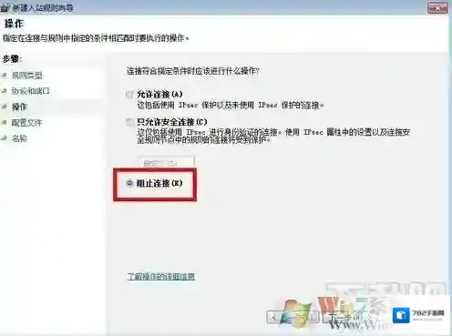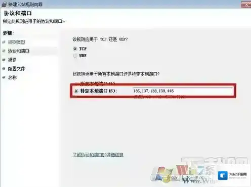 8、点击下一步,选择“特定本地端口”,输入“135,137,138,139,445”,端口号中间用逗号隔开即可,选择“阻止连接”,然后点击下一步;