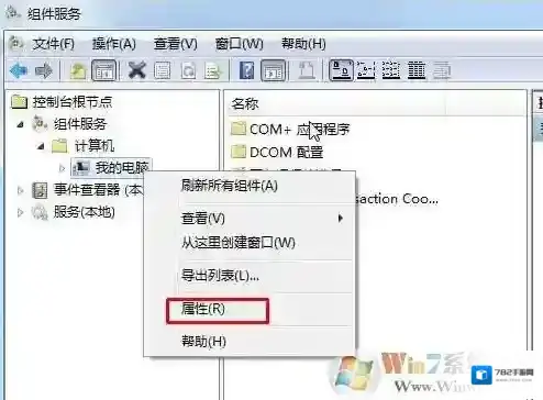 2、展开组件服务-计算机–我的电脑,右键单击“我的电脑”,选择“属性”。如下图