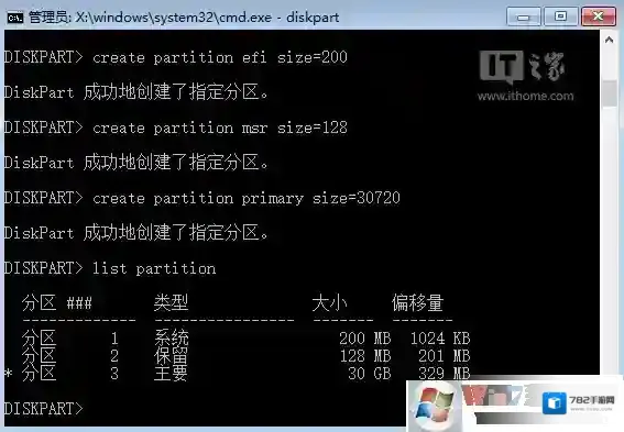 8、创建EFI分区,执行create partition efi size=200(分区大小为200MB),如图6所示