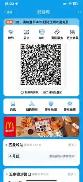 六、免密支付开通完成后,即可通过“一码通城”页面的电子二维码乘坐公共交通,入闸时扫描二维码免费通行。