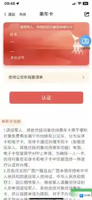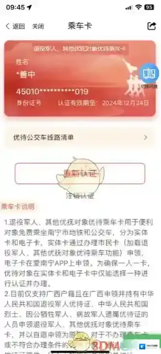 四、用户通过实人认证,获取退役军人、其他优抚对象优待乘车卡(电子卡)后,卡面脱敏显示用户信息,可查看乘车卡说明,或进行重新认证、注销认证。