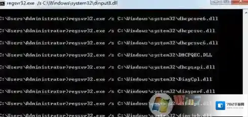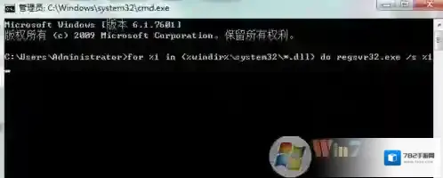 3、在弹出的CMD命令符界面,输入for %1 in (%windir%system32*.dll) do regsvr32.exe /s %1;