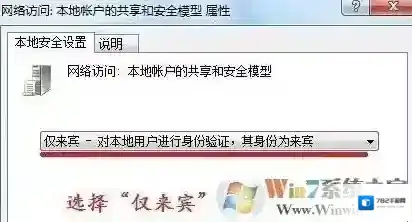 5、双击打开“网络模式:本地用户的共享和安全模型”项目,设置访问模式为”仅来宾-对本地用户进行身份验证,其身份为来宾,应用保存,如图所示: