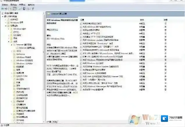 2、找到,在计算机配置-管理模板-系统-Internet通信管理-Internet通信设置,右边,关闭Windows网络连接状态指示器的活动测试,
