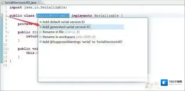 2、点击后,开发工具就会给我们自动生成了一个serialVersionUID。