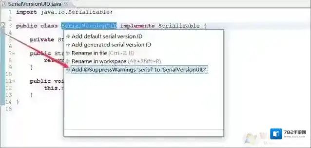 点击后,开发工具就会并没有给我们像上面一样生成一窜数字,而是在类名上面加了个@SuppressWarnings(“serial”)。这样就实现了serialVersionUID,如下图所示。