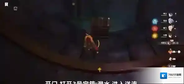 (8)继续追踪任务来到最后下图位置,利用千织的E技能和电梯一直上到最上面,打开上面开关后,门里面就是第3个珍贵宝箱,然后从宝箱前面进入水下后,随波逐流就会出副本了