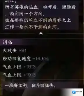 2、词条:火属性攻击加91、轻功回复速度加19.5%、气血上限加1913。