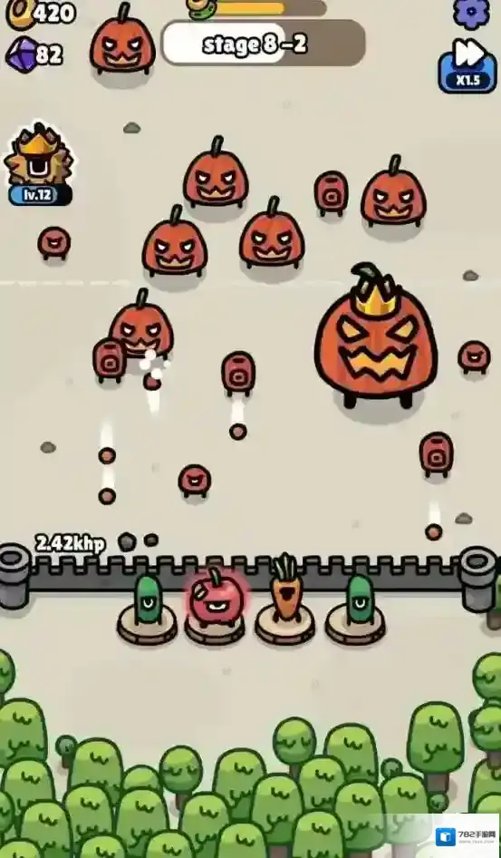 游戏的玩法很简单,上阵水果英雄守护你的城堡就可以了,这些英雄不需要玩家来手动操作,它们会自动攻击出现在范围内的敌人。游戏中的水果英雄很多,消耗金币就可以召唤,用获得的钻石解锁更多的位置来上阵更多的英雄,通过一个又一个的关卡来体验新的乐趣吧。