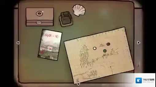 23、潜水艇—操作台视角:点击小桌板上的瓶中船,拔掉软木塞后用(鱼钩)勾住小船的桅杆,多次拉动鱼线后桅杆被拽断掉到了小桌板上,从桅杆的根部取出一张卡片,根据卡片上的提示在地图上找出对应的点,整合信息后获得坐标:“X:3、Y:4、D:50”;点击操作台,将获得的坐标输入。