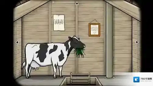 11、阁楼—奶牛视角:将(草)塞到奶牛的嘴里,点击几次让它吃下去(不然挤不出奶);将(锅)放到奶牛的肚子底下,根据墙上的纸头我们可以得知奶牛的每个奶头代表的符号,根据相框上的符号我们可以得知按照对应符号挤奶的顺序,按图中的顺序点击奶头,牛奶挤满了整个锅,获得(有牛奶的锅)(牛奶是将正确的顺序按完后一次性挤出来的)。