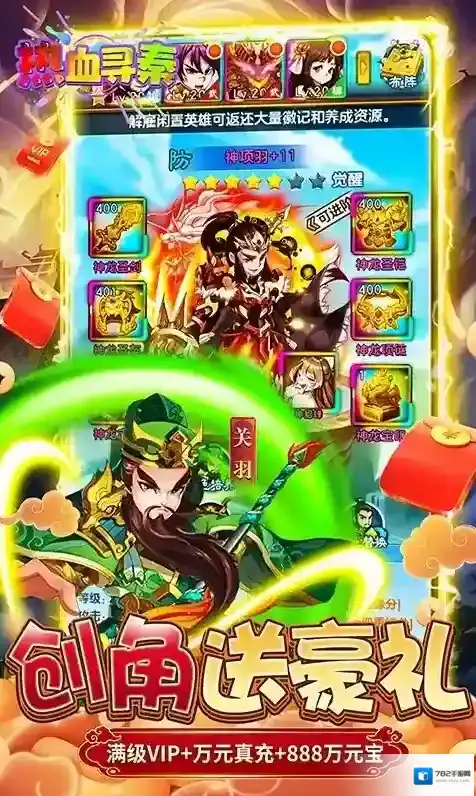 1、创角即送满级VIP、200秦晶、10000元真充卡、8888万金币、888万元宝、5000体力