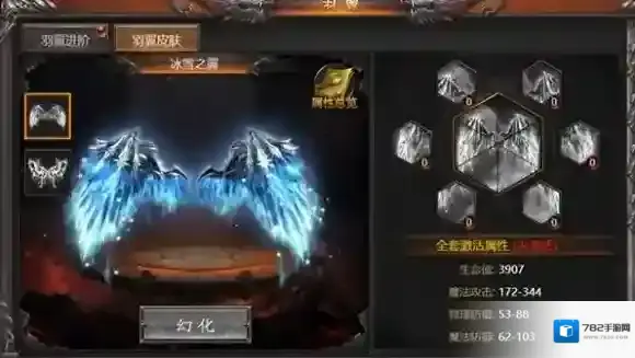 3、羽翼皮肤,可收集皮肤碎片,激活对应的羽翼皮肤,激活成功后获得相应的属性加成。如获得相同碎片,可升级同部位碎片属性。