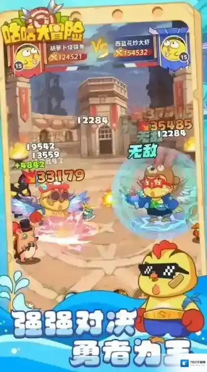 3、点击上方的冒险按钮可以派遣小鸡去闯关,小鸡会自动攻击敌人来完成挑战。