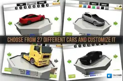 1、开始正式比赛前,大家可以自由的挑选喜欢的车辆,并且还能更换喷漆、轮毂等设置。