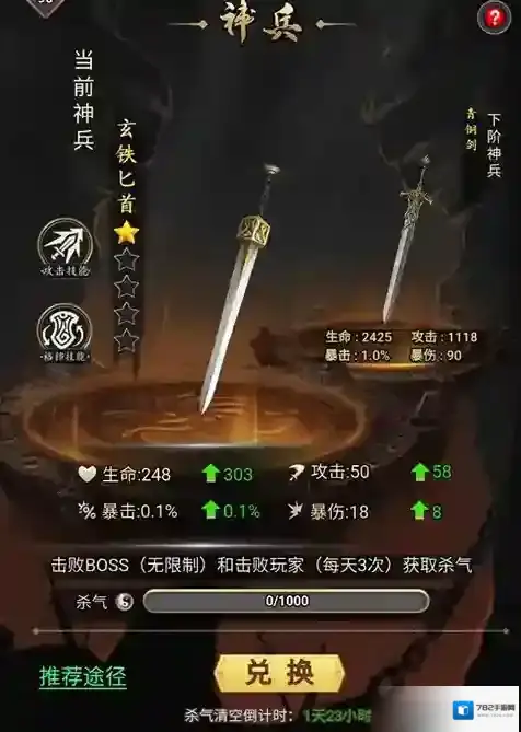 消耗杀气可升级神兵,随着神兵等级的不断提升,神兵外观将焕然一新,同时伴随着属性的飙升。每次的进化都是一次剑术的巅峰演绎,将助你在战场上傲立不败!