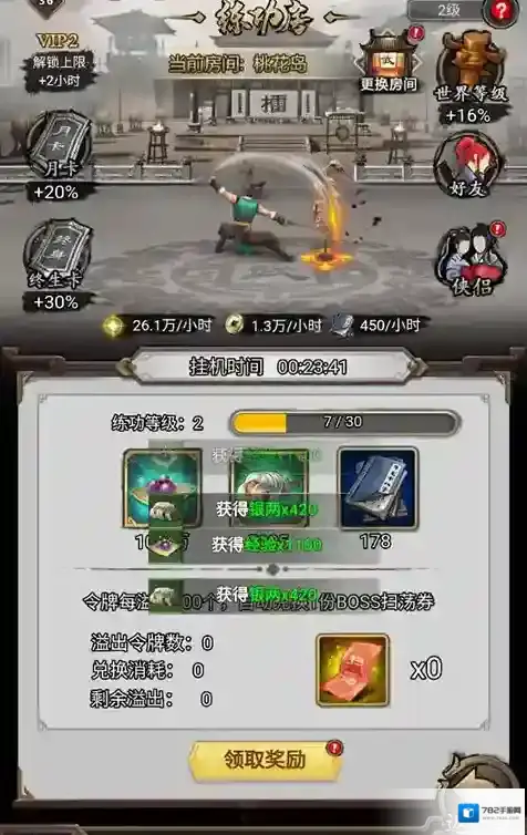 在练功房里,玩家可以悠闲离线挂机,获得丰厚的经验、银币、武学卡和BOSS扫荡券等奖励,练功时间越长,奖励越丰富,最长可达8小时。