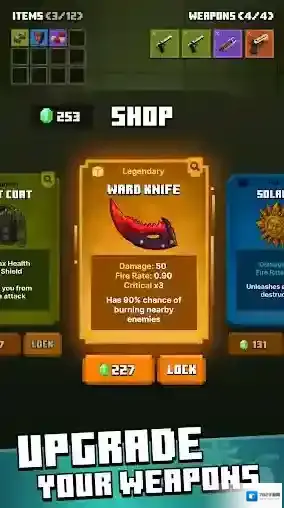 5、当玩家坚持一段时间后所有怪物会全部消灭,此时会进入商店,在商店里玩家可以用拾取的绿色晶石来购买不同的装备和武器。