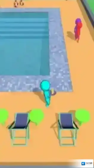 1、呈现泳池场景,有不同颜色的火柴人角色,玩家或需操控角色为泳池区域客人提供服务、完成任务,属于轻松的休闲游戏范畴。