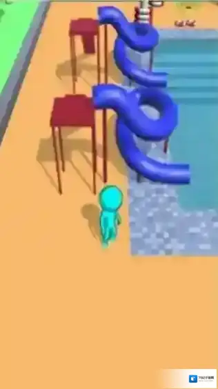 3、呈现水上乐园场景,有蓝色滑梯、火柴人角色,玩家操控角色在水上乐园场景(如通过滑梯、泳池区域)进行闯关、经营或休闲互动,属于轻松趣味的休闲。