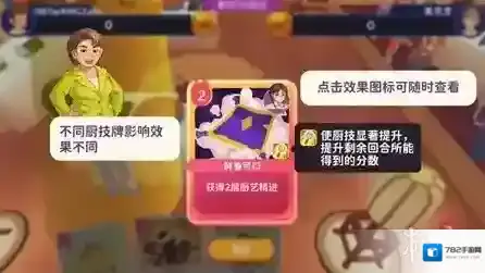 首先,要了解这些厨技牌的规则,可点击右下角图标查看,厨技牌大致分为己方分数增加对手分数减少正 buff负 buff这四种类型,简单概括就是加、减、乘、除的效果。