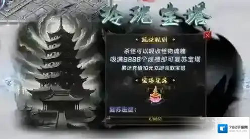 杀怪可以吸收怪物魂魄吸满8888个魂魄即可复苏宝塔,累计充值10元立即领取宝塔。