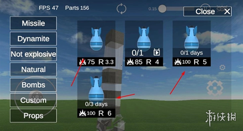 4、打开道具选择界面,挑选适合的爆破类道具,利用其破坏效果来提高建筑的损毁效率,从而积累更多积分。